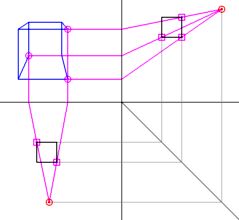 David wrote a java applet that uses a 2D construction technique to demonstrate perspective projection. This technique flattens the 3-D perspective problem down to two 2-D perspective projections, which can be done simultaneously on the same sheet of paper. His program allows the user to move the viewpoint around, select different models, and toggle lines on and off. His Perspective Assistant Page provides good documentation for a very cool applet.