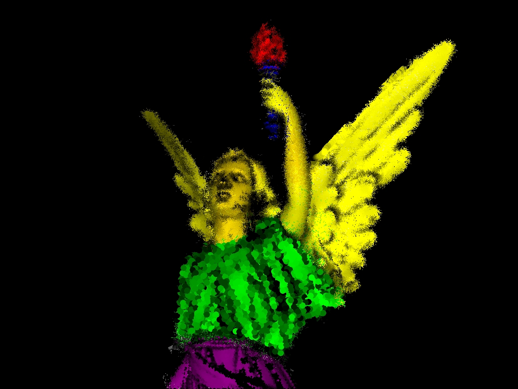 Fun Modifications In order to give our version of The Impressionist some added flexibility, we equipped it with a set of colors, roughly corresponding to the rainbow scale of ROYGBIV, which the user may select in lieu of the basic impressionistic option. By selecting one of these colors, the user is able to "paint" the image, and thus the statue, in whatever style they please. In order to switch between the coloring option and the standard CS248 impressionistic style, the user must select the "Toggle Paintbrush" option from the menubar. Lastly, the user may select between two different algorithms for coloring the statue. In particular, this "Toggle Shading" option allows the user to enable a coloring system in which the RGB value of the chosen color is scaled by the shade of the pixel underneath. Thus, if a red paint (1, 0, 0) were being applied to a pixel at a location where the original image was a gray shade of (0.5, 0.5, 0.5), the resulting RGB value outputted to the screen would correspond to (1, 0, 0) * (0.5, 0.5, 0.5) = (0.5, 0, 0). It is important to note that this system assumes that the original image is of a greyscale format.