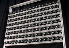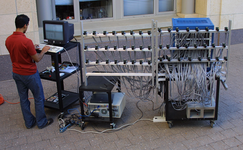 The Stanford Multi-Camera array consists of 100 VGA video cameras controlled by four computers. The array was built by Bennett Wilburn during his PhD [1]. It has per-camera hardware for real-time processing, allows cameras to be arranged in different configurations, and can even be transported outdoors. For more details, please visit the Stanford Multi-Camera Array website.