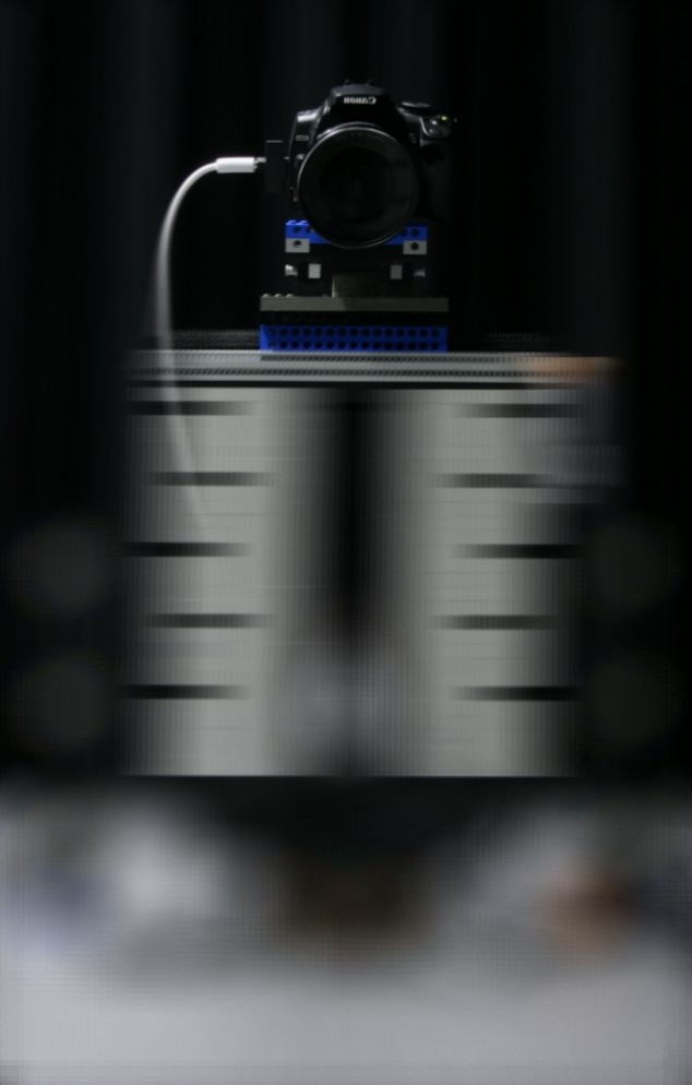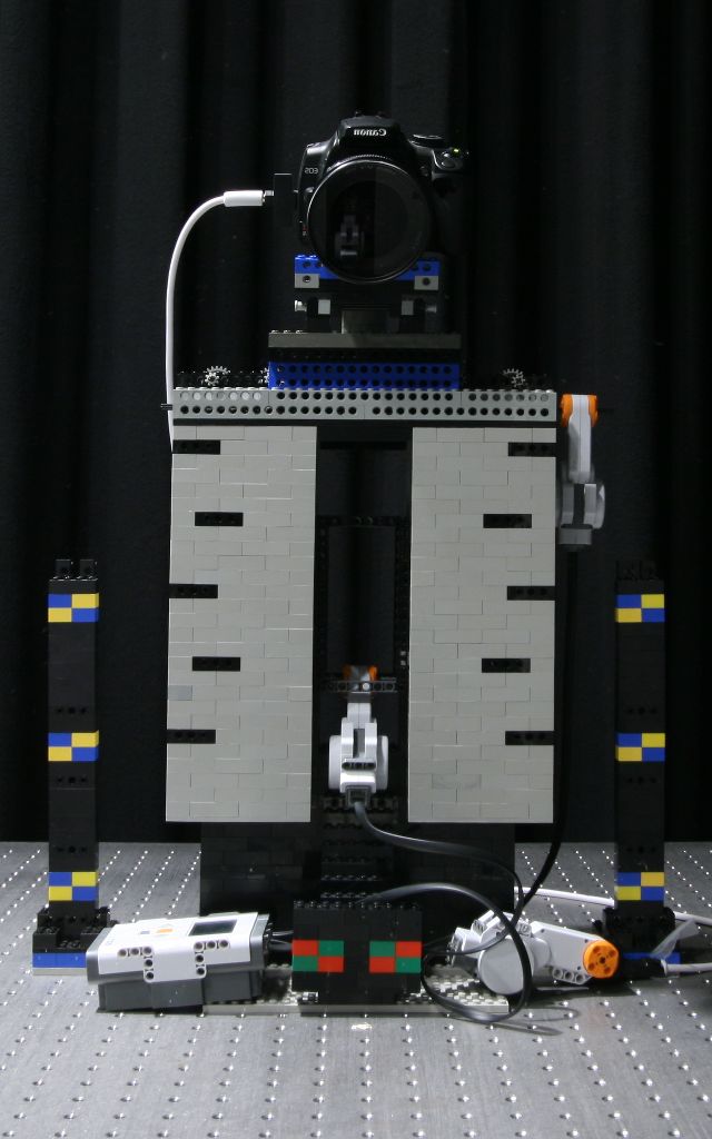 This simple Lego Mindstorms gantry demonstrates that you don't need fancy equipment to capture a light field - just a method to move a camera left, right, up, and down. The Mindstorms motors have rotary encoders, so with enough gearing down and solid construction this can be made to be very accurate and repeatable. The accuracy approaches that of the light field gantry, while remaining portable. One caveat is that there will always be some slop in the gearing, so it's a good idea to always approach a position from the same direction.
