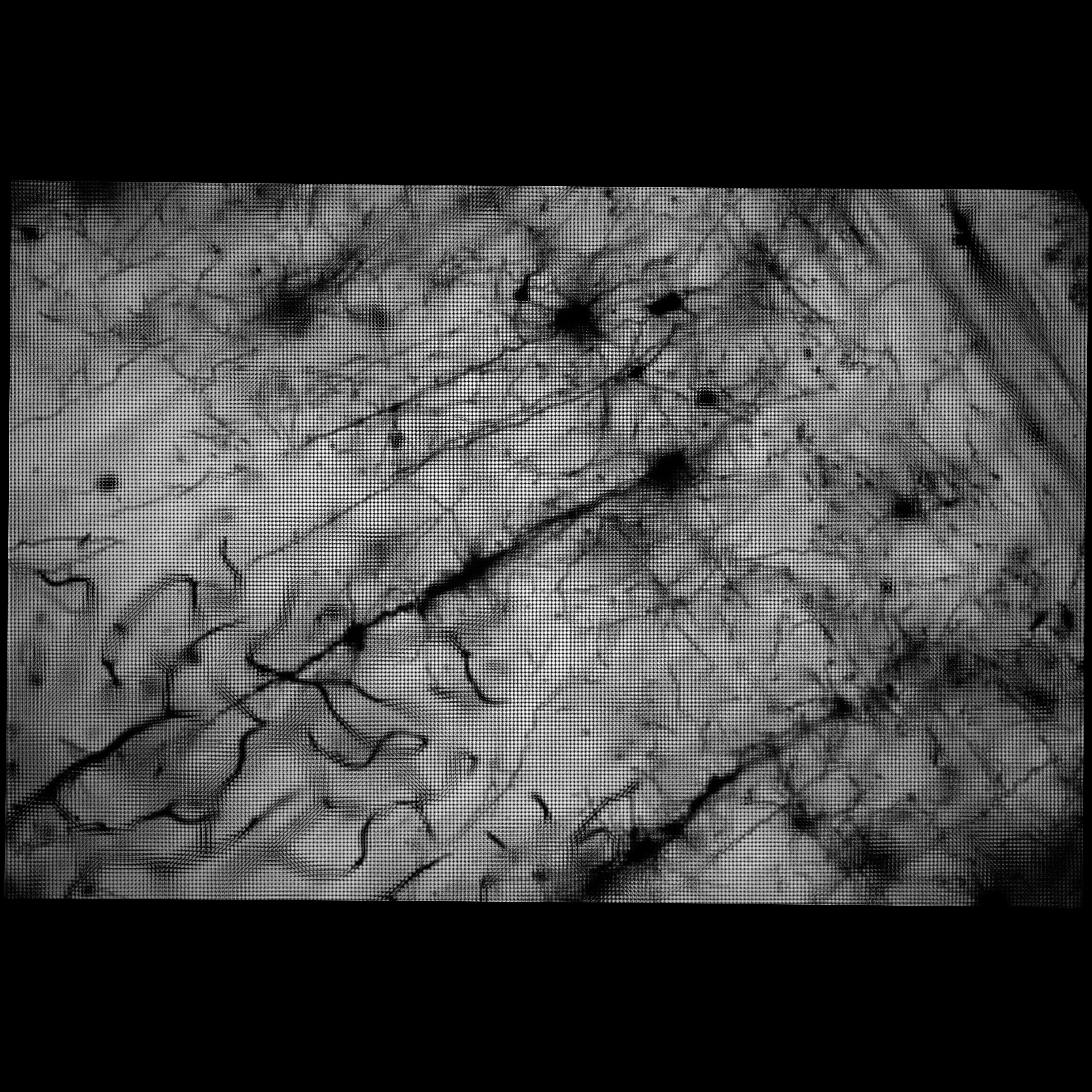 256 views on a 16x16 grid, image resolution 289x289 A Golgi-stained slice of rat brain (courtesy of Shinya Inoue, Marine Biological Laboratory), imaged with a 20x/0.75NA (dry) objective. Lateral spatial resolution on the specimen is 1.5 microns. Angular resolution is about 5 degrees. In other words, when panning across the light field in pinhole mode using our Flash-based viewer, each step is 5 degrees. |
