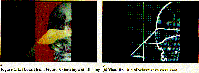 Figure 4. (a) Detail from Figure 3 showing antialiasing. (b) Visualization of where rays were cast. |