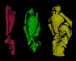 Left: Three meshes scanned from different viewpoints using our scanner. Right: The meshes have been aligned into a single coordinate system.