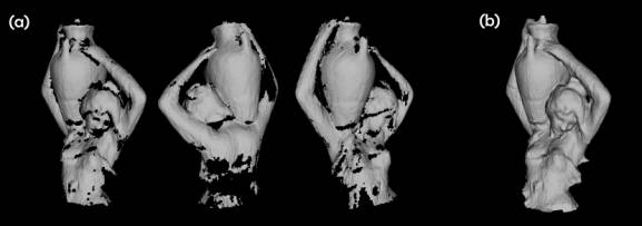 (a) A volumetric method was used to merge twenty-two scans into a single mesh. The single mesh is shown from three viewpoints. (b) A hole filling technique was used to fill holes remaining in areas not observed in the scanning process.