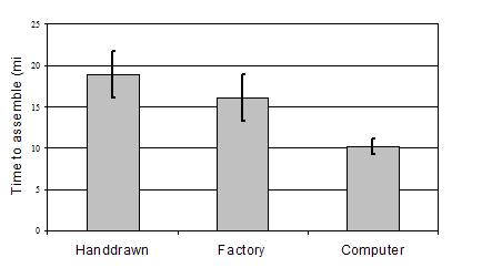 Figure 2. Time to assemble TV stand by instruction set. Instructions generated by automated system ( M = 10.2, SE = .929) outperformed the top rated instructions (M =18.9, SE = 2.81) from Experiment 1 and the factory made instructions that accompanied the TV stand (M = 16.04, SE = 2.9). | ||||||