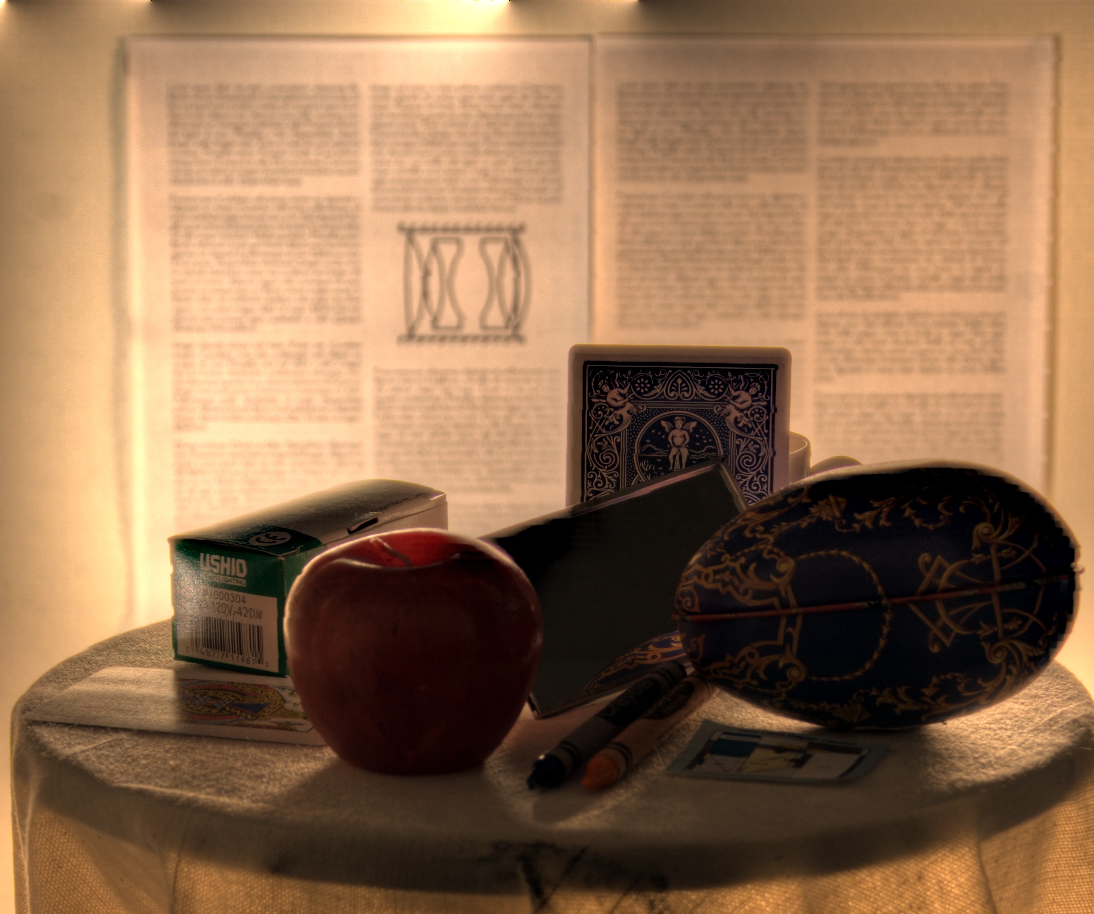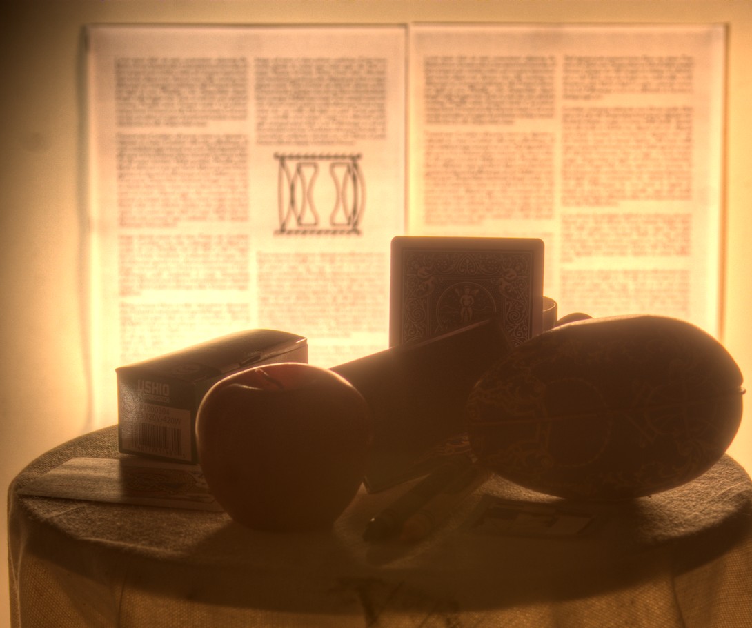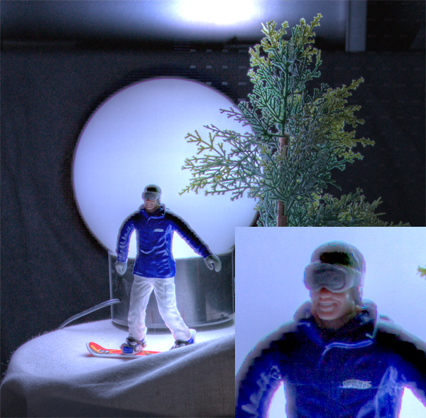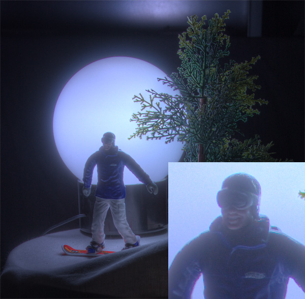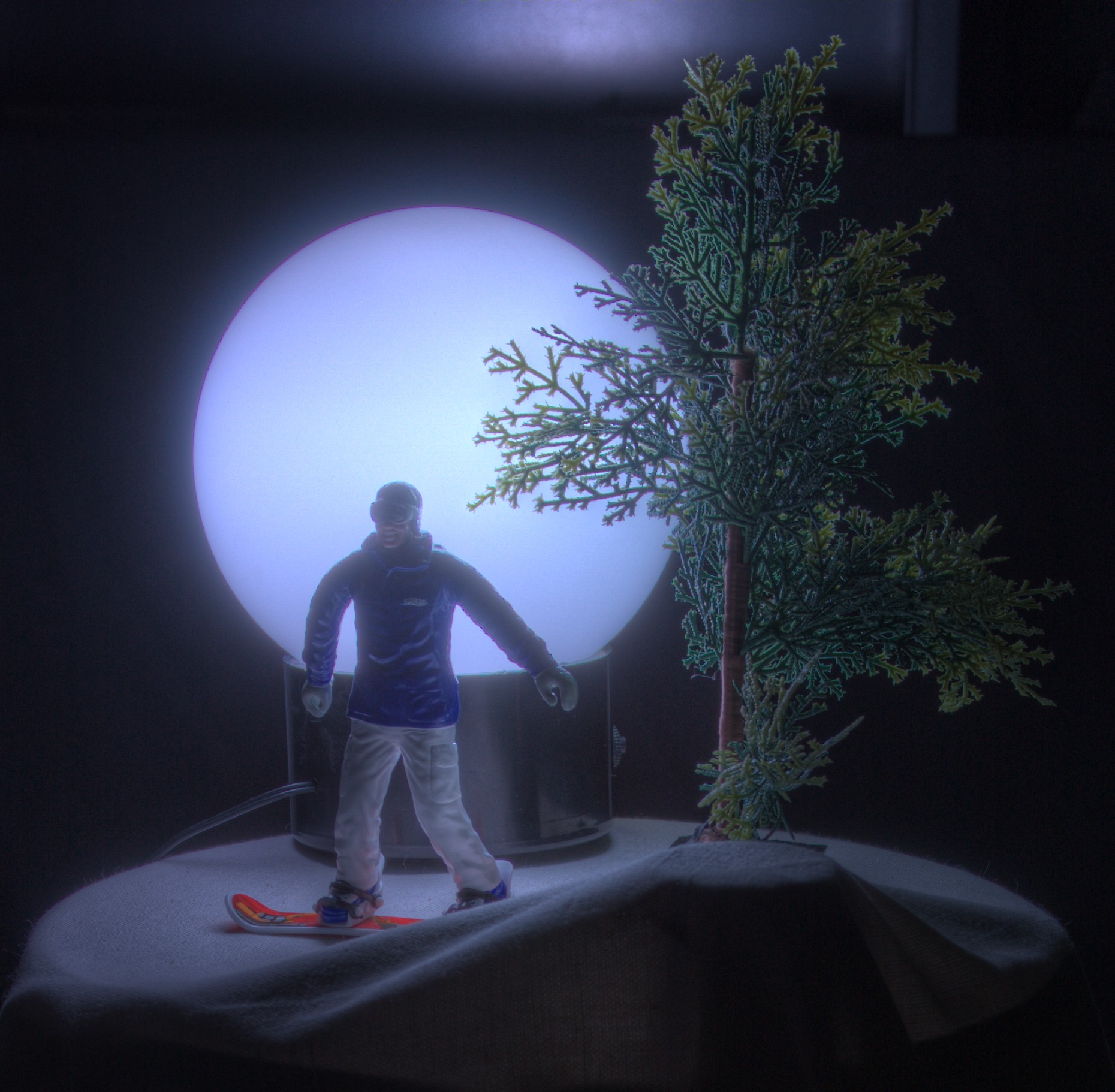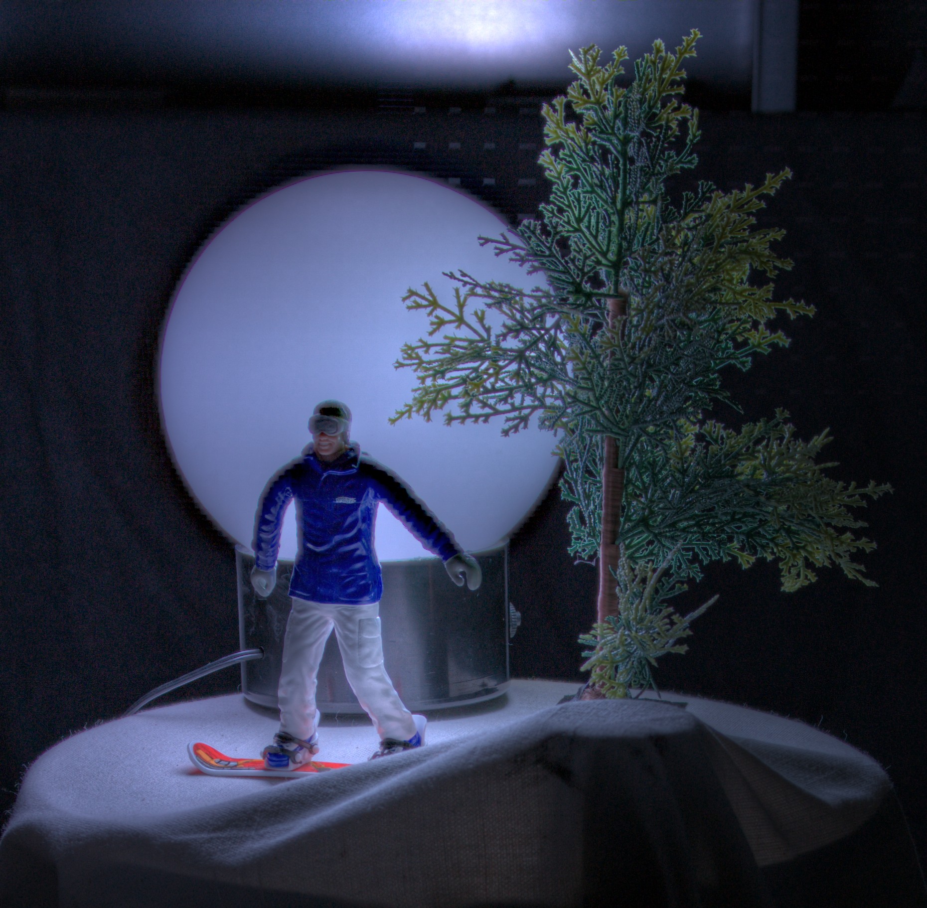 Figure 1: A strongly backlit still life Figure 2: Still life with glare removed Figure 2. A mock image of a snowboarder silhouetted by a full moon Figure 3. The snowboarder with the glare removed