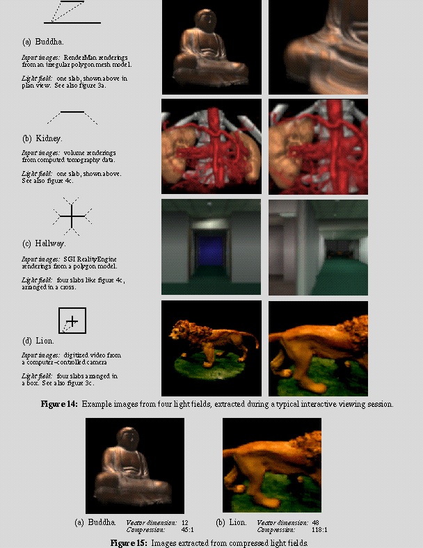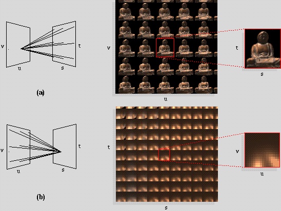 The idea of light fields did not originate with these papers. As a footnote in our paper explains, this idea dates back to Arun Gershun's classic 1936 paper on the vector irradiance field [2] and Parry Moon's later papers on the scalar irradiance field, which he called the photic field [3]. The idea that the light field reduces to a 4D function in free space has been observed by many people (see our paper for citations). The idea that by extracting 2D slices from this 4D function one could construct new perspective views of a scene is ours, dating to a 1993 sketch in one of Marc Levoy's notebooks [4]. The ideas of parameterizing light fields using intersections of rays with two planes, and the relationship between light field antialiasing and the aperture of a camera, are also ours. (The latter idea also appears in the holography literature.) These ideas were communicated to the authors of the Lumigraph paper, who were already working on acquiring and representing arrays of images, during several chance meetings in March, April, August, and November of 1995. These meetings led them to pursue a similar development path. The ideas of using 3D geometric information during image reconstruction, and of building a light field from irregularly sampled input images, are theirs.
