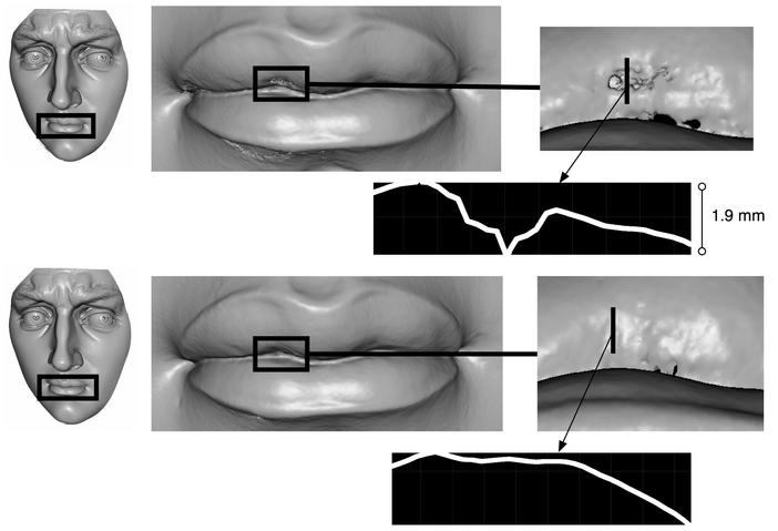 | Figure 2. The face of Michelangelo's David. Top: alignment and merging under incorrect calibration. The lips exhibit gross misalignments on the order of 1.9 mm. Bottom: our results. The artifacts in the lips have been greatly reduced. | |||