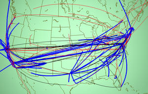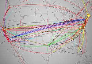 Another way to help the user understand the details of dense tunnel structures is by thresholding, where only part of the tunnel arc is drawn. The mode that we found the most useful is to elide the middle of the tunnel, leaving partial arcs ascending from each endpoint as in Figure 4.6. The thresholding technique for reducing clutter was used in previous network visualization systems [BEW95], thus it is not novel. It is a simple and obvious first choice that was effective, echoing the entire arcs-on-globe visual metaphor. We needed the thresholding capability to check for problematic areas in the American Midwest, which was hidden by the large number of tunnels between the East and West coasts.