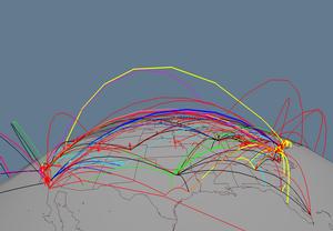 Figure 2.4: Horizon view, arc height and grouping. Three visualization techniques are used in this figure: distance-based arc height, 3D navigation and grouping. The ``horizon view'' results from zooming close and clicking on a point on the earth's surface to act as the center of rotation. Moving our eyepoint close to the earth also emphasizes the different arc heights. Finally, the group of tunnels running the PIM protocol are drawn with a different color and linewidth than the rest.