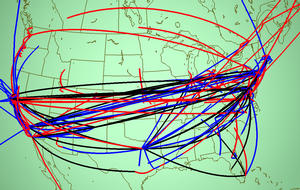 Figure 2.8: MBone tunnels grouped by backbone status. Here we show the United States in June 1996, which is the same data as the right side of Figure 4.7. Groups are color-coded according to whether tunnel endpoints are belong to a major backbone Internet Service Provider. We sought to understand whether the profusion of coast-to-coast tunnels was excessively redundant or a reasonable consequence of the commercialization of the US backbone. Top Left: Black tunnels, which have a major provider at both ends, are emphasized. If most of the long tunnels were black, then the redundancy might be quite reasonable. Top Right: Blue tunnels, which have one endpoint on a backbone and one endpoint in a non-backbone domain, are emphasized. These tunnels are possibly legitimate, since ISP network administrators are presumably more motivated to make sure that their bandwidth is not being wasted than an average corporate or university sysadmin. Bottom Left: Red tunnels, which have neither endpoint on a major backbone, are emphasized. These are prime targets for suspicion, and there are a distressingly large number of them. Bottom Right: All three groups are equally emphasized with the same line weight, so that their relative sizes can be compared visually.