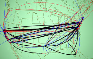 The US topology seemed to be highly nonoptimal at first glance. Although the MBone maintainers knew that there were some redundant tunnels, the sheer number of coast-to-coast tunnels visible with the Planet Multicast display was surprising even to them. We split the tunnels into groups according to the major Internet Service Provider (ISP) backbones to investigate further. Figure 4.8 shows the tunnels partitioned into three sets: both tunnel endpoints belong to a major backbone (black), one endpoint is on a backbone and the other is not (blue), or neither endpoint connects directly to a backbone (red). We learned two lessons from the color coding: first, some of the redundancy may be legitimate, in the cases where the long-distance tunnels belong to major national backbones. Second, many of the long-distance tunnels are not directly under the control of the backbones, and these are good candidates for further investigation by the MBone maintainers.