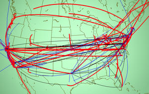 We can partition the dataset into groups of tunnels using the batch pipeline discussed in section 4.4. Those groups can then be manipulated in the browser by interactively choosing different colors and linewidths, or explicitly choosing to draw or hide the group. Figure 4.4 shows a scene where one group of tunnels is distinguished from the rest via color and linewidth. More color and linewidth changes are shown in Figures 4.8 and 4.9, in order to help separate the coast-to-coast tunnels that were likely to be legitimate from those that were potentially problematic.