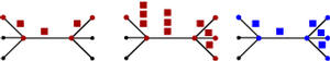 Figure 2.1: Transport protocols. Left: Unicast packet transport (shown here in red) was designed for one-to-one communication. Middle: Unicast packets sent from one source to multiple destinations results in congestion. Right: Multicast transport protocols allow packets (shown here in blue) to flow from one source to multiple destinations efficiently by dynamically maintaining a spanning tree of network links.