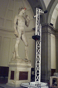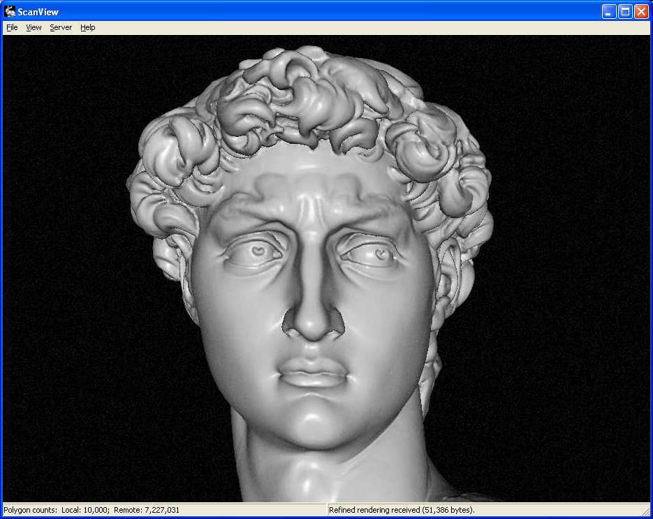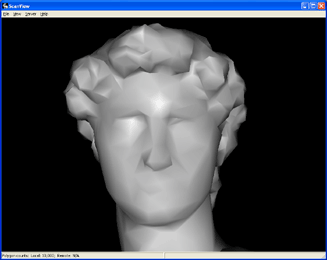 Demonstrating recent improvements in digitizing the shape of physical objects, a team of 30 faculty, staff, and students from Stanford University and the University of Washington spent the 199899 academic year digitizing the sculptures and architecture of Michelangelo, including the well-known sculpture of David. Our main scanning device was a laser triangulation rangefinder mounted on a motorized gantry (a), using it to digitize the marble statues with a spatial resolution of 0.25mm, dense enough to capture Michelangelo's chisel marks. After scanning, our range data-processing pipeline aligned the scans taken from different gantry positions, combined them into a unified surface mesh, and automatically filled any small holes that could not be seen by the scanner [2]. Scanning the David took three weeks, with 400 individually aimed scans resulting in two billion polygons of data. Reduced-resolution versions of the resulting 3D model have been used to make computer renderings (b) and for a variety of scientific and scholarly studies.