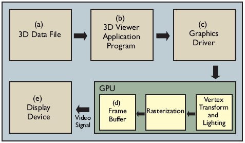 Figure 1. Abstracted graphics pipeline showing possible attack locations (a-e) for recovering 3D graphics data from an interactive viewing program: