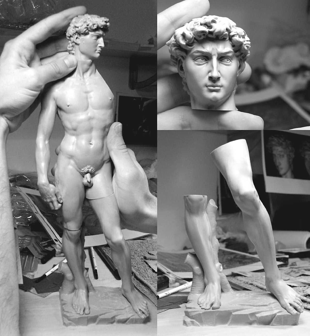 A simplified 1.25-million polygon model of the David was the basis for replicas we have manufactured in collaboration with Gentle Giant Studios (www.gentlegiantstudios.com/). We used a thermojet wax printer to make a master (c), following with a latex molding and casting procedure. The final replicas (d), standing 15 inches tall, are made of plastic resin, though other materials (such as marble dust in a binder) can be used.