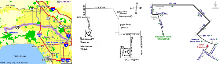 SummaryRecently, route maps in the form of driving directions have become widely available through the Web. In contrast to hand-designed route maps, these computer-generated route maps are often more precise and contain more information. Yet these maps are more difficult to use. The main shortcoming of current systems for automatically generating route maps is that they do not distinguish between essential and extraneous information, and as a result, cannot apply the generalizations used in hand-designed maps to emphasize the information needed to follow the route.Figure 1 shows several problems arising from the lack of differentiation between necessary and unnecessary information. The primary problem is that current computer-mapping systems maintain a constant scale factor for the entire map. For many routes, the lengths of roads can vary over several orders of magnitude, from tens of feet within a neighborhood to hundreds of miles along a highway. When a constant scale factor is used for these routes, it forces the shorter roads to shrink to a point and essentially vanish. This can be particularly problematic near the origin and destination of the route where many quick turns are often required to enter or exit a neighborhood. Even though precisely scaled roads might help navigators judge how far they must travel along a road, it is far more important that all roads and turning points are visible. Handdrawn maps make this distinction and exaggerate the lengths of shorter roads to ensure they are visible. Another problem with computer-generated maps is that they are often cluttered with information irrelevant to navigation. This extraneous information, such as the names and locations of cities, parks, and roads far away from the route, often hides or masks information that is essential for following the route. The clutter makes the maps very difficult to read, especially while driving. Handdrawn maps usually include only the most essential information and are very simple and clean. This can be seen in figure 1(middle) where even the shape of the roads has been distorted and simplified to improve the readability of the map. Furthermore, distorting the lengths of shorter roads and removing unnecessary information makes it possible to include and emphasize helpful navigational aids such as major cross-streets or landmarks before the turns. This paper presents two main contributions in the area of automatic route map design: Route Map Generalization Techniques We have developed a set of generalization techniques specifically designed to improve route map usability. Our techniques are based on cognitive psychology research which has shown that an effective route map must clearly communicate all the turning points on the route, and that precisely depicting the exact length, angle, and shape of each road is much less important. We consider how these techniques are applied in handdrawn maps and show that by carefully distorting road lengths and angles and simplifying road shape, it is possible to clearly and concisely present all the turning points along the route. Automatic Route Map Design System We describe LineDrive, an automatic system for designing and rendering route maps. LineDrive takes advantage of our route map generalization techniques to produce maps that are much more usable than those produced by standard computer-based map rendering systems. By introducing the flexibility to distort road lengths, angles and shape, we create a large space of possible map designs. LineDrive performs a focused randomized search over this space to quickly find a near-optimal layout for the roads, labels, and context information. An example of a LineDrive map is shown in figure 1(right). Paper (Siggraph 2001):