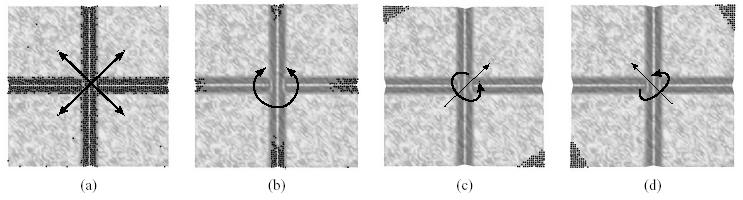 | Points picked by our algorithm to constrain the unstable motions of a patch with two grooves. (a) Points constraining two unstable translational eigenvectors. (b) Points constraining unstable rotation. (c)-(d) Two remaining rotations are stable so they only require a few points. The eigenvector corresponding to translation in z is well constrained by the already picked points and does not contribute to the sampling. |