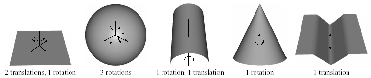 | By analyzing the eigenvalues and eigenvectors of the covariance matrix derived from the points on the shapes, we can determine that the above shapes are unstable. Below each figure is the number and type of instabilities. The axis of unstable rotation and direction of unstable translation are indicated on the shapes. |