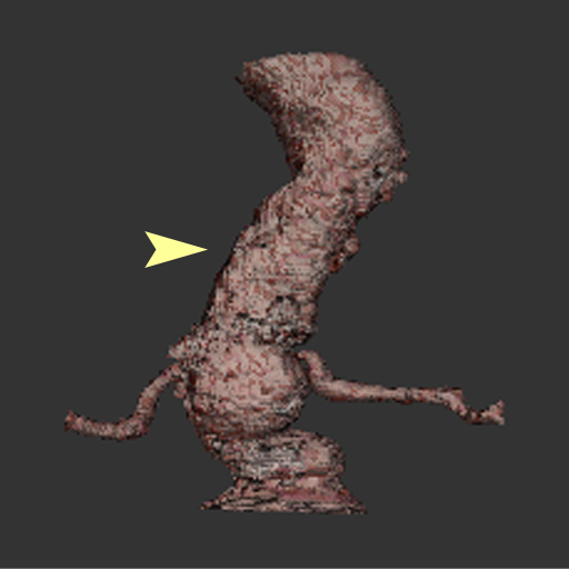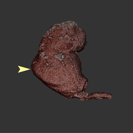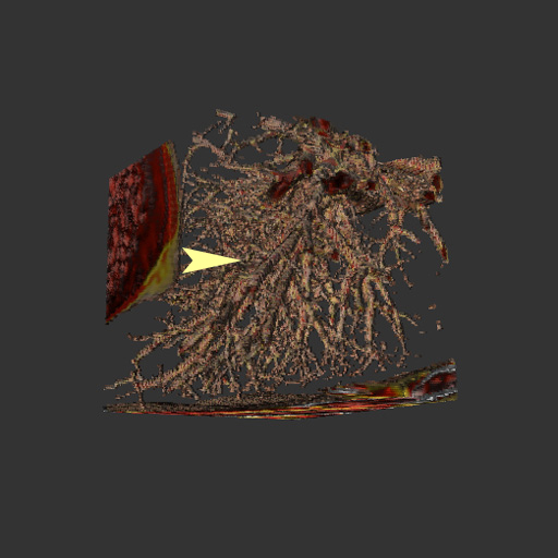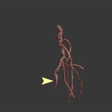 These four volume renderings utilize a fully opaque transfer function, but are segmented using the method discussed in this paper. The segmented volumes show: (a) abdominal aortic branch vessels, (b) an aortic aneurysm, (c) an aorta, and (d) peripheral blood vessels in the lung. The yellow arrows indicate the location of the user's initial seeds that were evolved to form the presented segmentations.