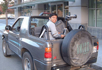 The panorama above (at right) is a portion of the north side of Castro Street in Mountain View, CA. This panorama was constructed by aligning and pasting together narrow vertical strips extracted from consecutive frames of a video sequence. The sequence was captured by a sideways-looking high-speed video camera mounted in the back of a slowly-moving car (shown at left, manned by PhD student Gaurav Garg). To reduce distortion in the trees and alleyway, a mosaic of cross-slit projections and ordinary perspective views is employed. The lines of sight for this mosaic are shown in plan view beneath the panorama.