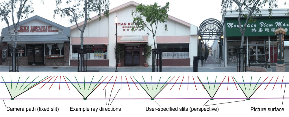 Visualization of cities and urban landscapes has been a recurrent theme in western art. The key problem in making these visualizations successful is summarizing in a single image the extended linear architectural fabric seen at eye level along a possibly curving or turning street, and doing so without introducing excessive distortions. At the Stanford Computer Graphics Laboratory, we have been building technology for digitizing commercial city blocks from sideways-looking video taken from a vehicle driving down the street. The input to our system is a set of video frames with known camera pose. The output is a single multi-perspective image that summarizes one or more city blocks. In our work, we have explored the use of pushbroom panoramas, cross-slit panoramas, and mosaics of these non-perspective projections interleaved with ordinary perspective views. Possible applications include in-car navigation, online route visualization, and web-based tourism. Broader applications of multi-perspective panoramas from video captured by moving vehicles include remote sensing and mapping, underwater photography, and archaeological documentation. This project is funded by Google.