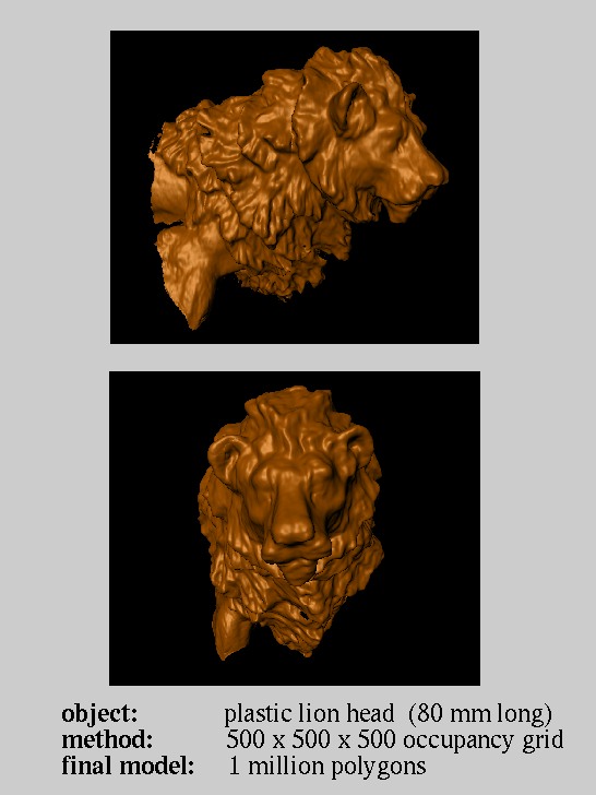 Toward this end, we have been developing a laser-based scanning system capable of generating an occlusion-free low-level geometric description of the externally visible surfaces of an object. Here is a flow chart of the process. (This flow chart is somewhat out of date.) The crucial step in this process is the merging of multiple range images, each of which captures only one side of the object, in order to produce a seamless description of the entire object. The representations we have investigated for this step include dense polygon meshes and 3D voxel arrays with an occupancy function at each voxel. Both representations eventually lead to a dense polygon mesh. We have also been exploring methods for fitting curved surface patches to these dense meshes. Future investigations include automatically determining the next best view and acquiring surface reflectivity.