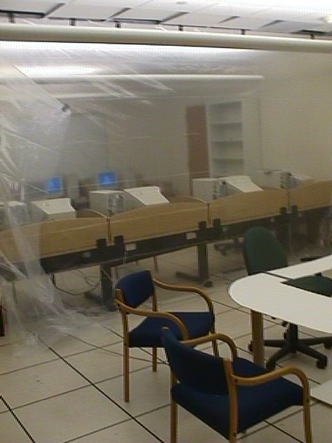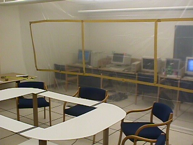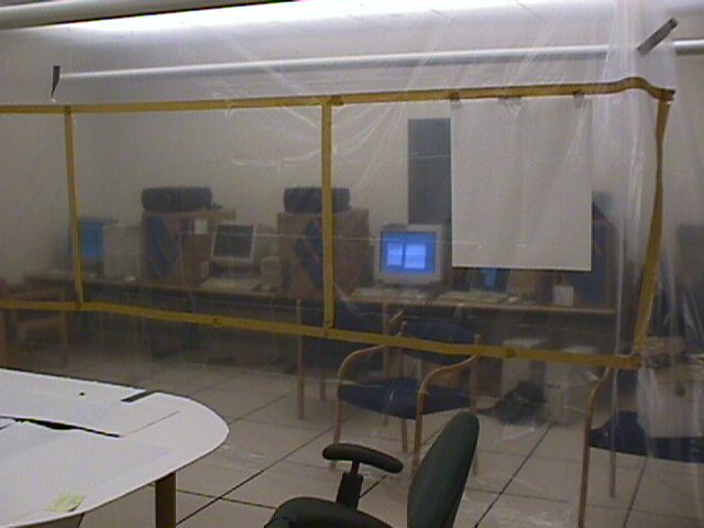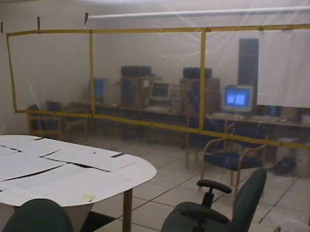 The partition wall, that may eventually have a 12 screen mural on it. Currently planned to have a normal white board and tack board.