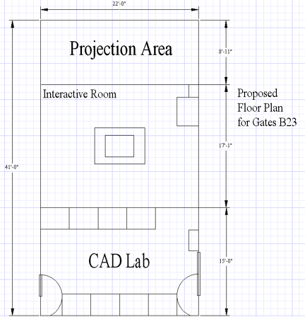 The dimensions of the room are 41' x 22'. We have segmented the room into three parts: CAD Lab, the room, and a projector area leaving approximately 22' x 19' (roughly the same size as Gates 392 conference room.)