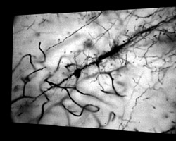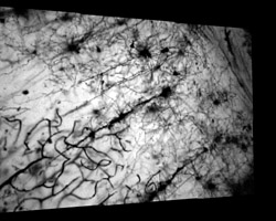 The two columns above represent two light fields captured using this high-resolution microscope. The specimen is a Golgi-stained slice of rat brain (courtesy of Shinya Inoue, Marine Biological Laboratory). The light field at left was photographed using a 20x/0.75NA objective, and the light field at right using a 40x/1.3NA oil immersion objective. Note the spatial detail in both movies; you can easily see the fine dendrites. Note also the large amount of parallax visible in the 40x movie, especially on the looping capillaries in the lower-left part of the field of view. This much parallax is available because a 1.3NA objective can capture rays leaving the specimen at angles up to 59 degrees on either side of the optical axis. For photographers, this would correspond to a lens having a relative aperture of f/0.38 - far faster than any commercially available photographic lens.