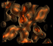 Volume rendering of two concentric isovalue contour surfaces from a 24 x 20 x 11 voxel portion of an electron density map for Staphylococcus Aureus ribonuclease. To enhance comprehension of the outer surface, its opacity in the leftmost image alternates between complete transmission and complete attenuation based on the value of a solid texture containing a honeycomb of small rectangular cells, creating a "burlap sack" effect. In the rightmost image, this modulation of opacity is suppressed, and the shape of the outer surface becomes harder to see.