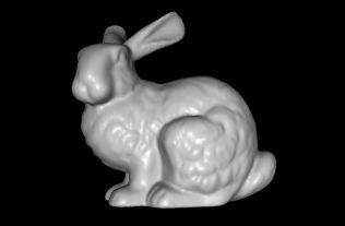 The Stanford Bunny model was originally constructed in 1994 by Greg Turk and Marc Levoy using a technique they developed to create polygonal models from range scans (see their paper). The Bunny model they created consisted of exactly 69,451 triangles; we are using this model in our rendering server. There are five holes in the Bunny model: three of these were the result of inadequate coverage when scanning, and the two circular holes on the base existed on the physical Bunny, which was hollow.