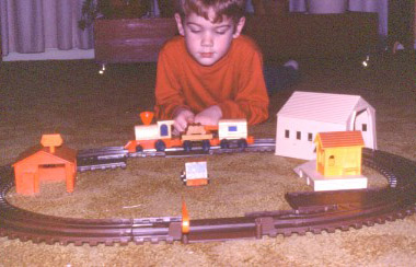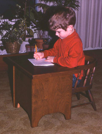 These two photos show me posing with some new Christmas presents I received at age 4. On the left is me and my first train set. In the second photo, I'm seated at a wooden desk that my father custom-built to match my dimensions. The desk top swings up on hinges to uncover a storage compartment. The wooden chair was built by my great-great-grandfather back around 1880.