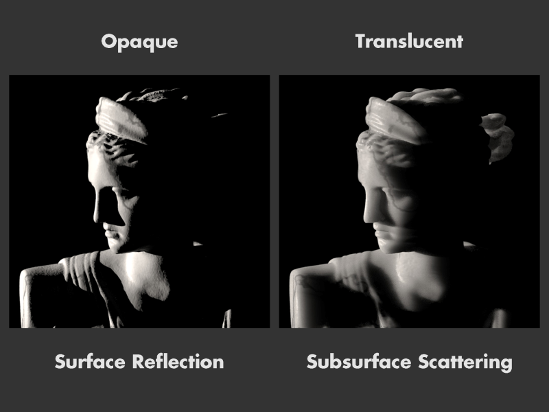 For example, a few years ago, Henrik Wann Jensen, Steve Marschner, Marc Levoy and I developed a simple approximation for simulating translucent materials, such as the marble in this bust of Diana the Huntress. The key physical idea that explains the appearance is subsurface scattering. Light crosses the surface, diffuses inside the material, and finally exits at a neighboring point. Comparing the two images, we see that translucent marble has a very pleasing appearance. Shadows are soft and bumps are deemphasized.