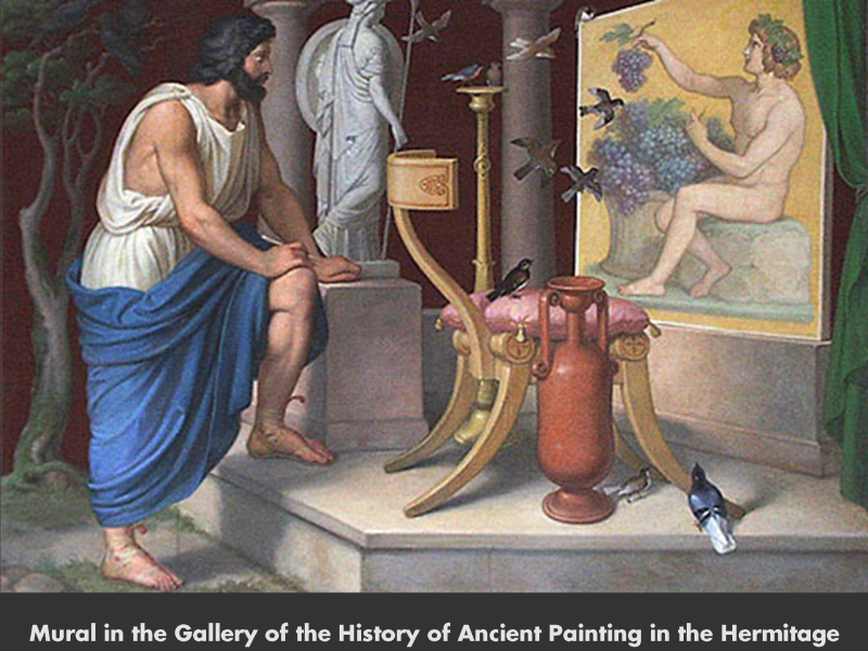 Pliny the Elder told the story of two rival painters, Zeuxis and Parrhasius, who were competing to see who could produce the most realistic painting. The story goes that Zeuxis had painted a picture of grapes so realistically, that birds were deceived enough to peck at the fruit. After Parrhasius finished his painting, he invited Zeuxis to his studio. Zeuxis tried to lift the curtain from the panel to see the painting underneath. To his surprise, the panel was a painting of a curtain. Zeuxis conceded that Parrhasius was a better painter, whereas he had deceived only birds, Parrhasius had fooled a human being.