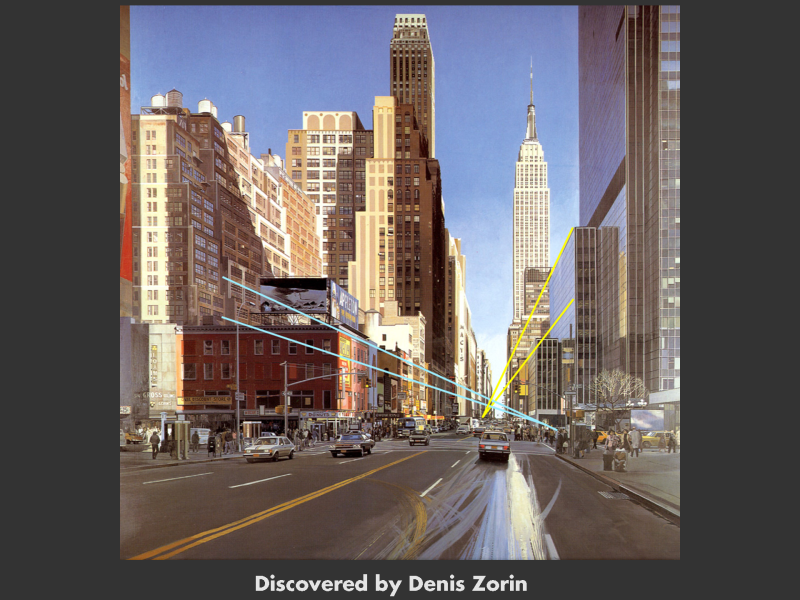 Why did Estes separate the vanishing points in this way? In order to create a more interesting composition. To show the entire street scene he would have to increase the field of view. But wide-field-of-view photos look distorted. To avoid this undesirable effect he shifted the left and right sides of the street scene closer together, in the process producing inconsistent vanishing points.