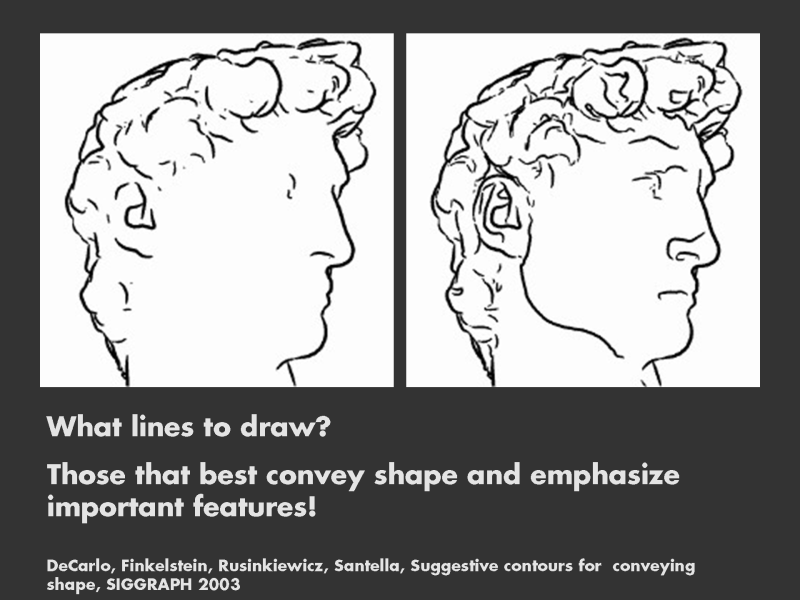I consider the problem of what are the best lines to draw to be one of the more interesting problems in computer graphics and visual cognition. DeCarlo et al. recently published a clever new idea. They propose the use of suggestive contours, contours that may appear given small perturbations in position. When added to a line drawing containing only silhouettes, the resulting line drawing is much better. But we are still a long way from Picasso or Matisse.