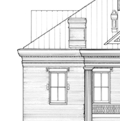 The other drawing I made of Rural Mount showed some of the interior details, including the main staircase and one of its decorative brackets. Click here to see the drawing at 100 dpi, and click here for a blowup of just the stair elevation. The brackets are interesting because they resemble designs from builder's handbooks of the late 18th century. As such, they are one of the elements used to verify the date of construction of the house. |