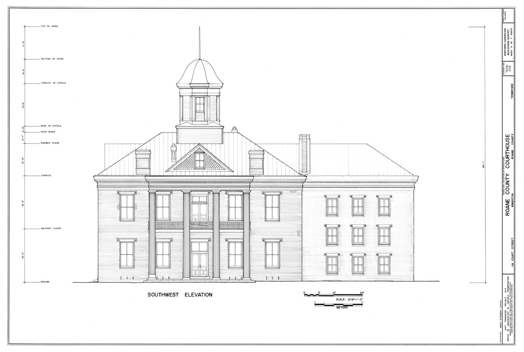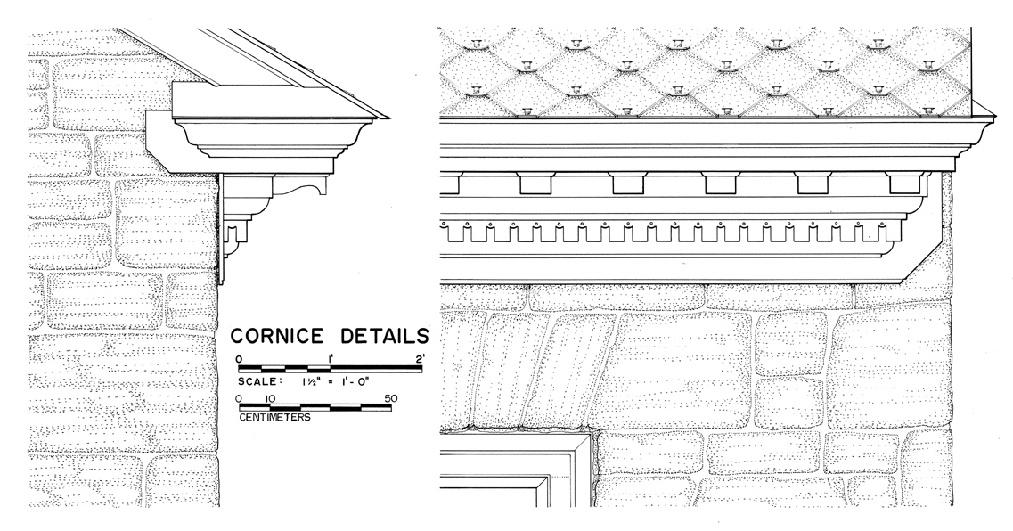 Several months had elapsed since I drew the Roane County Courthouse (see above), and my technical proficiency had improved considerably. Here is a blowup of the cornice details from the foregoing elevation drawing. I am particularly proud of this drawing, which the National Park Service has reproduced in a number of general HABS publications about the recording of America's architectural heritage. |