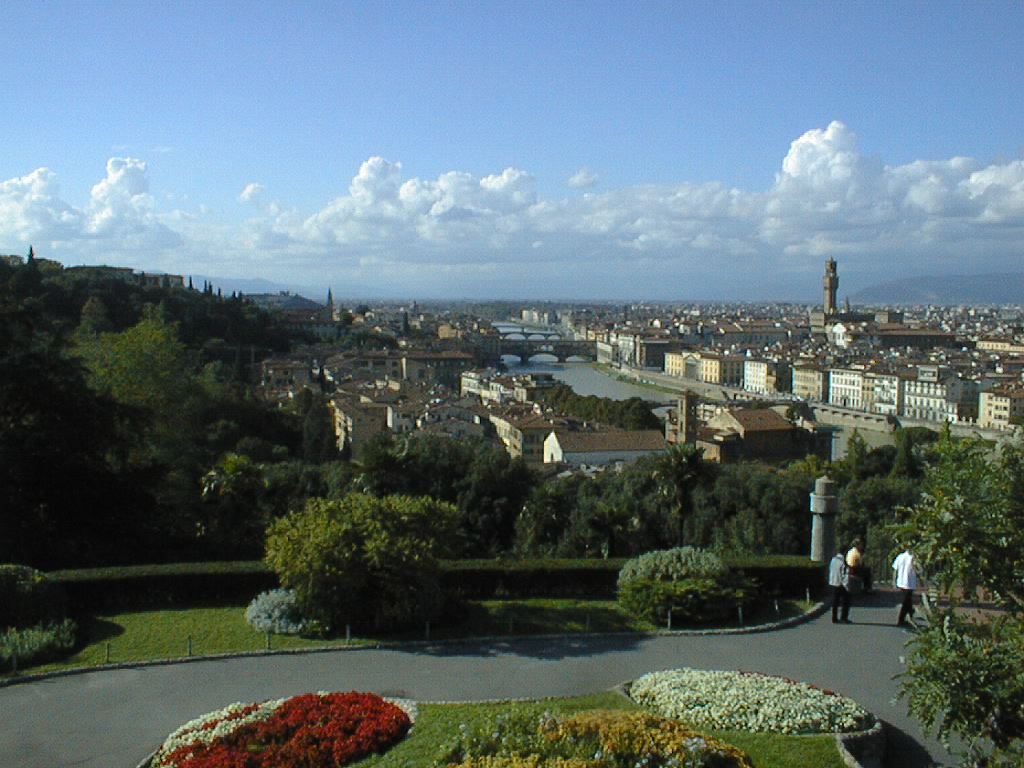 The view west, down the Arno. The three bridges are the
