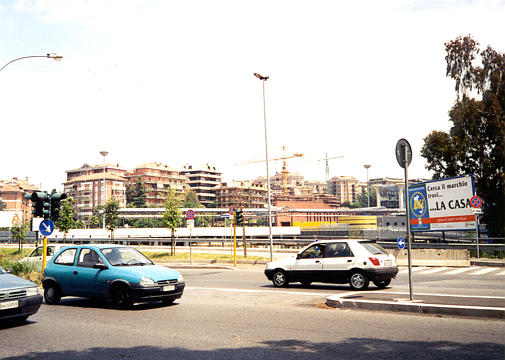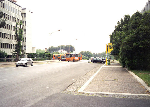 ++ A view of the street outside our apartment building. As another sign of Italian reliability, one bus is stalled in the street, while another bus approaches. |