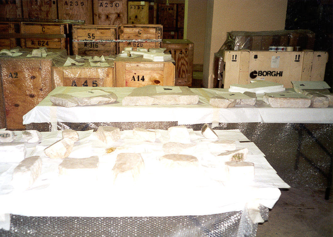 ++ Just a few of the 1300 "rocks" (map fragments), laid out carefully on bubble wrap, with their identification papers. The crates in the background contain rocks still yet to be scanned. |