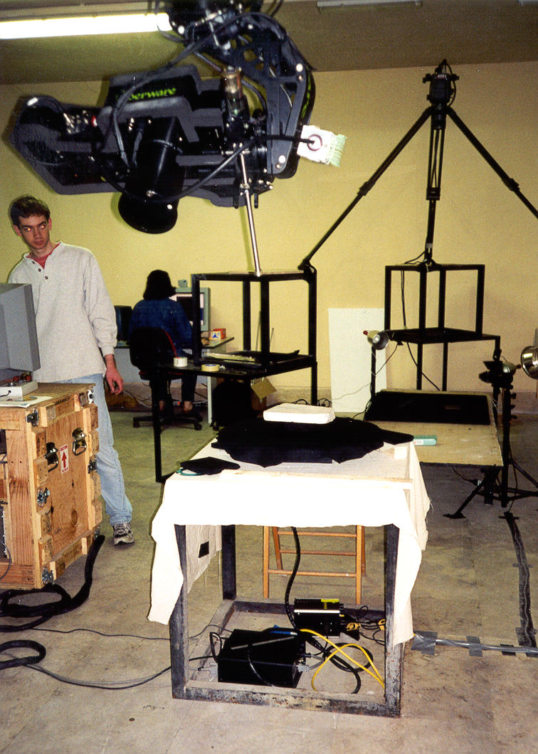 ++ Each rock was placed on one of the two scanners' turntables. Here a fragment is being scanned by our big scanner. |