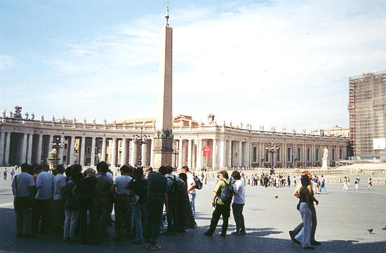 ++ Approaching the entrance to St. Peters, you pass the clothing police (The guy in the dark suit with his back turned). The clothing police stood on the steps, turning back any women who dared attempt to enter St. Peters in shorts. Out in the piazza, many vendors did good business selling wrap-around skirts... |