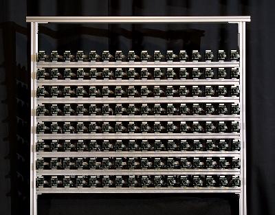 The Stanford Multiple Camera Array. My research focus at Stanford is high performance imaging using cheap image sensors. To explore the possibilities of inexpensive sensing, I designed the Stanford Multiple Camera Array, shown at left. The system uses MPEG video compression and IEEE1394 communication to capture minutes of video from over 100 CMOS image sensors using just four PC's. The array has been operational since February 2003, and since then we've developed our geometric and radiometric calibration pipelines and explored several applications. |