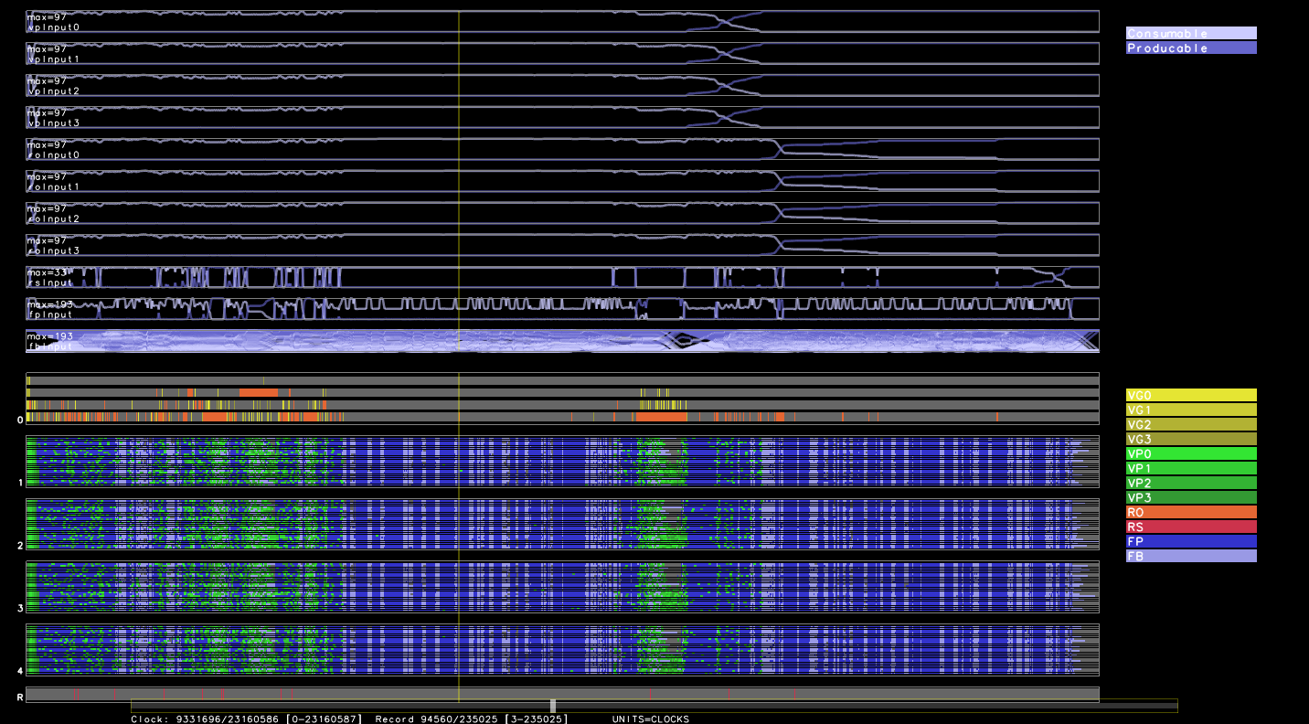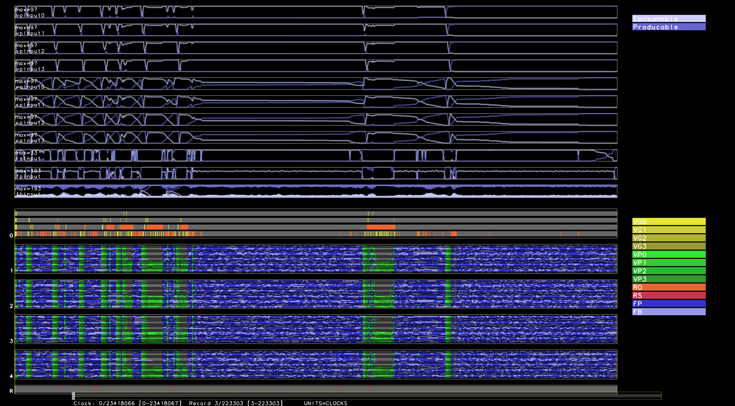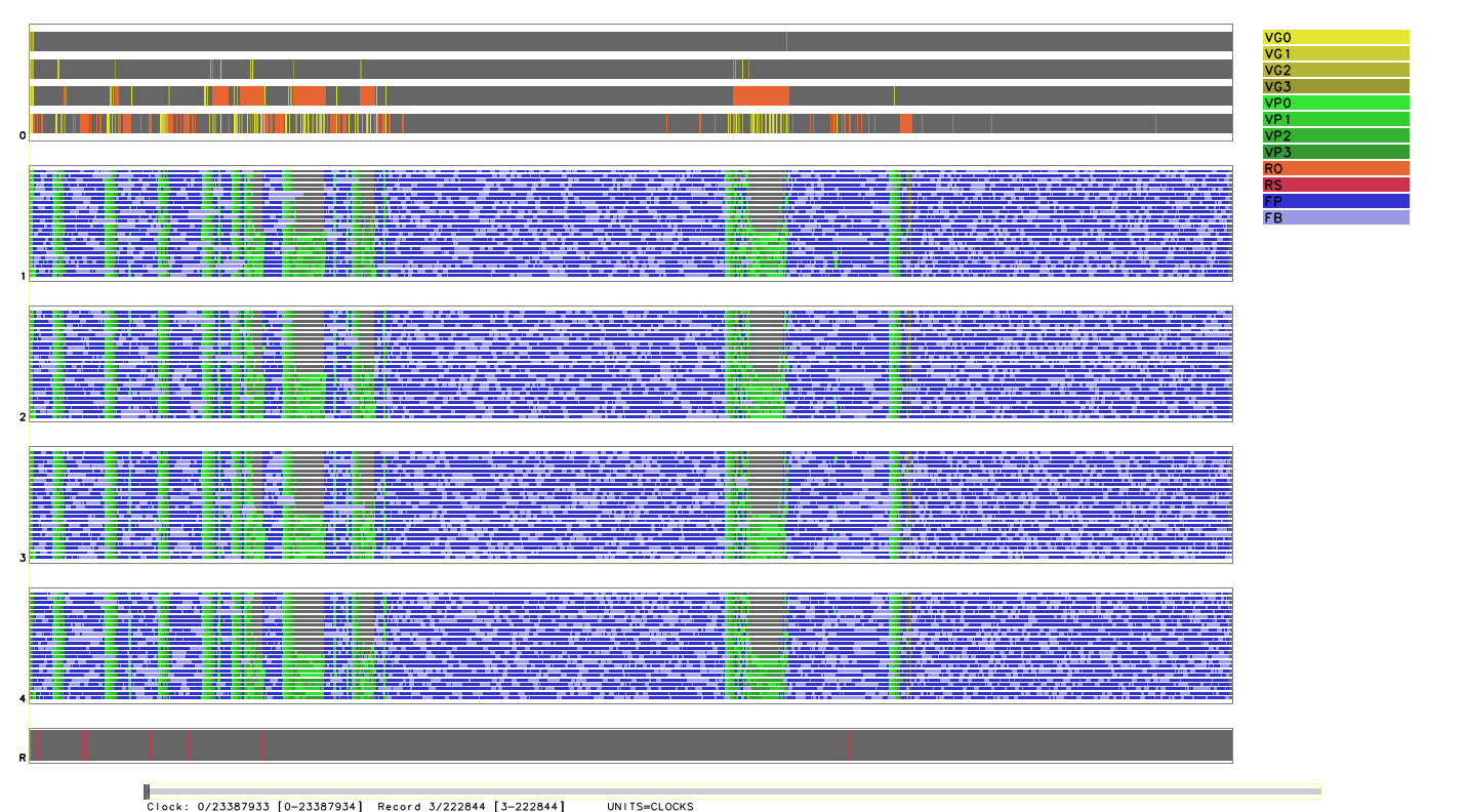 It's worth noting that the lazy scheduler has exactly footprint trade-off against the eager scheduler that one would predict. Here is the same occupancy picture for the eager scheduler. It goes through far more vertex - fragment - blend cycles and has the pipeline bubbles from exhausting all fragment work, but not being able to fill the machine with vertex-work alone. The thing is, lazy does not have significantly better thread slot occupancy and (unsurprisingly) it has a much higher queue footprint. The lazy scheduler gets 95.3% occupancy with a 5.5 meg worst case queue footprint. The eager scheduler gets 95.0% -- almost the same -- but has a 1.3 meg footprint. Clearly I need to understand the bubble in the lazy scheduler. It may also be that eager will be unfairly successful so long as scheduling is 'free'.