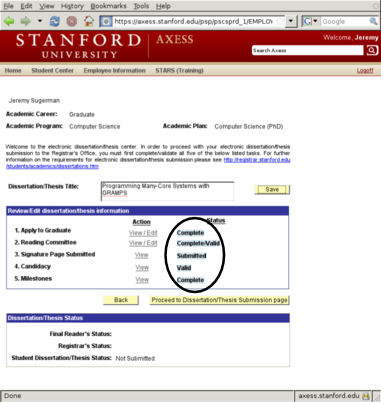 Date: Fri, 27 Aug 2010 08:45:30 -0700 From: [ Stanford Registrar ] Subject: Registrar Approval Mail Congratulations! Your dissertation/thesis id 0000000545 has been approved by the Office of the University Registrar. Please find the comments as: Congratulations!. The following are the details: Name of the Student: Jeremy Sugerman Academic Career: GR Academic Program: CS Academic Plan: CS-PHD Milestone title: Programming Many-Core Systems with GRAMPSNaturally, Pat's final comments were changes to the figures. Equally naturally, coercing LaTeX into complying took far longer than the simple nature of the requests. Here's the official pdf (slated to appear here once the University / Library digests it). As Jeff warned, the post-processing to insert the copyright and signature pages made the bookmarks and metadata a little wonky, so here's the final presubmission pdf, too.