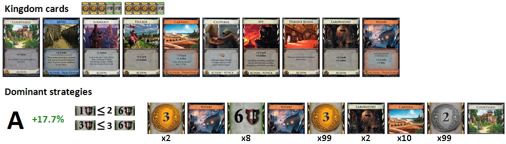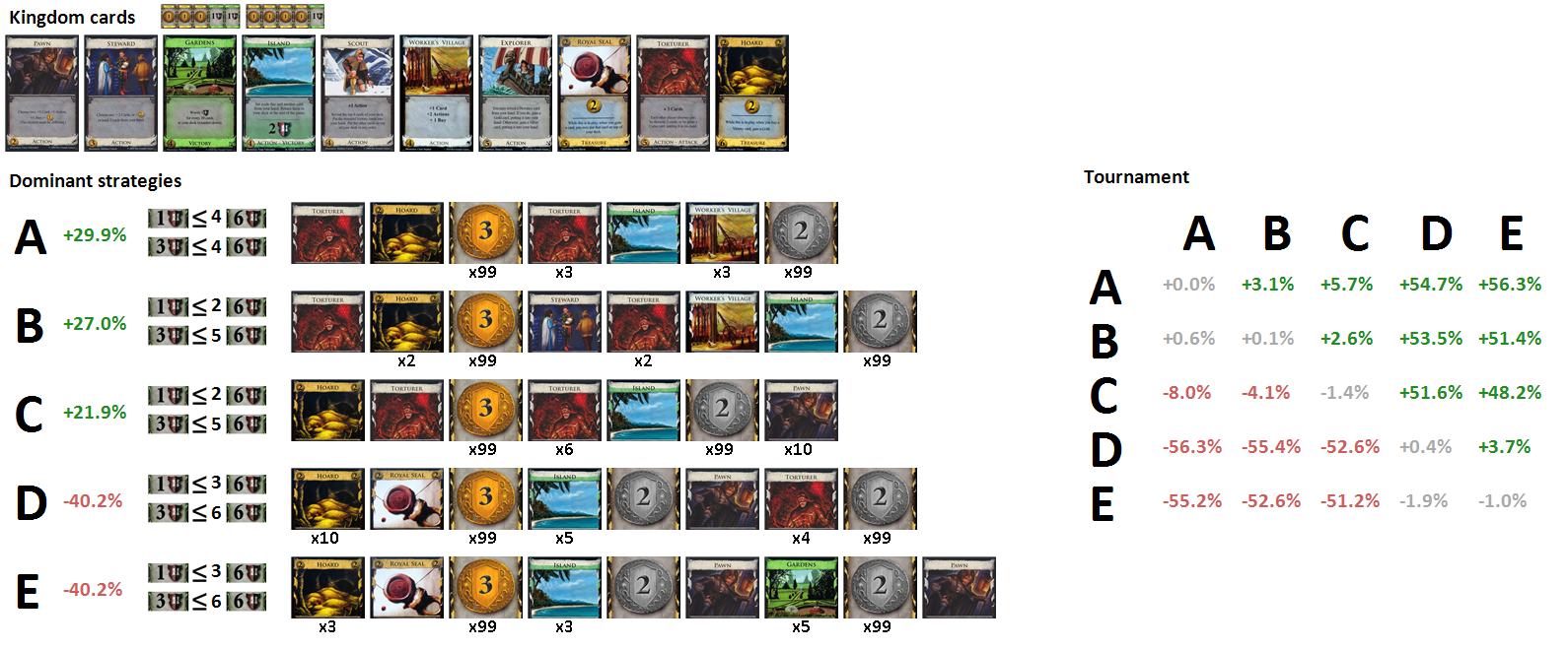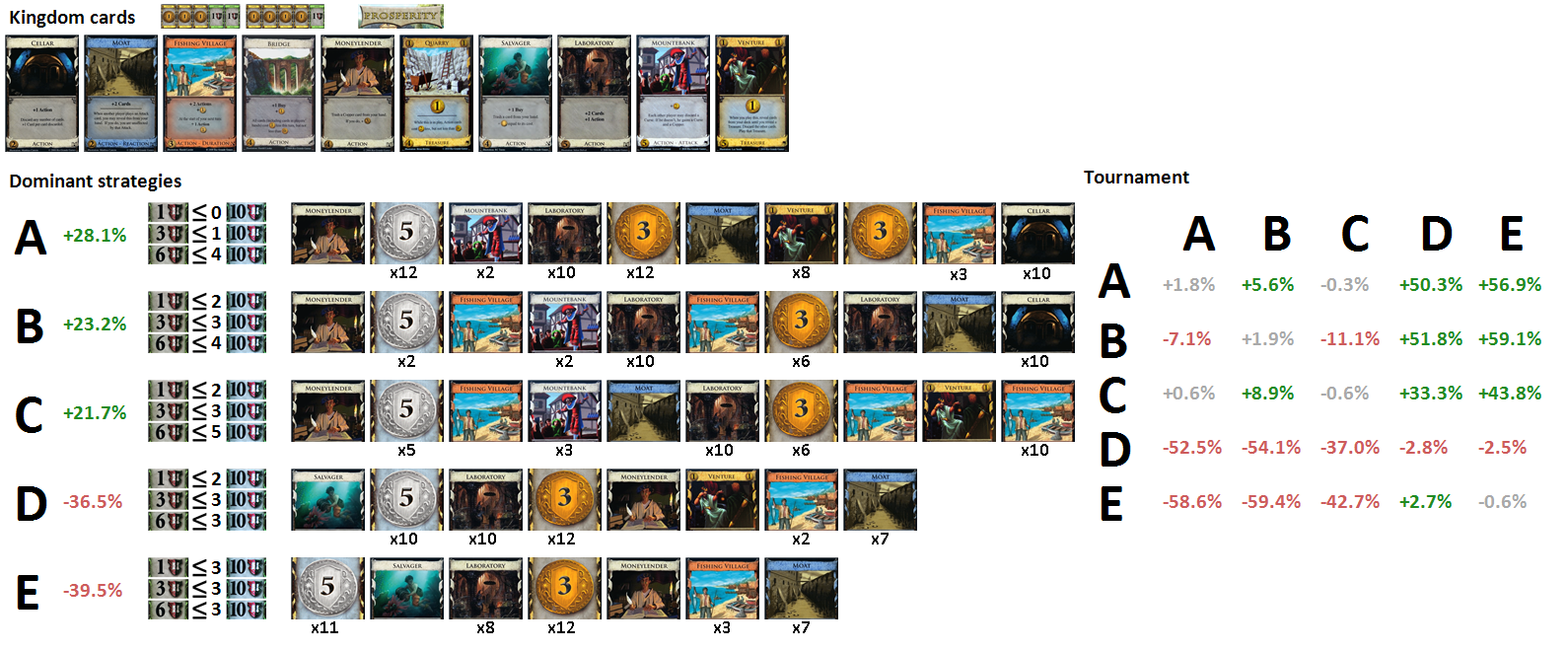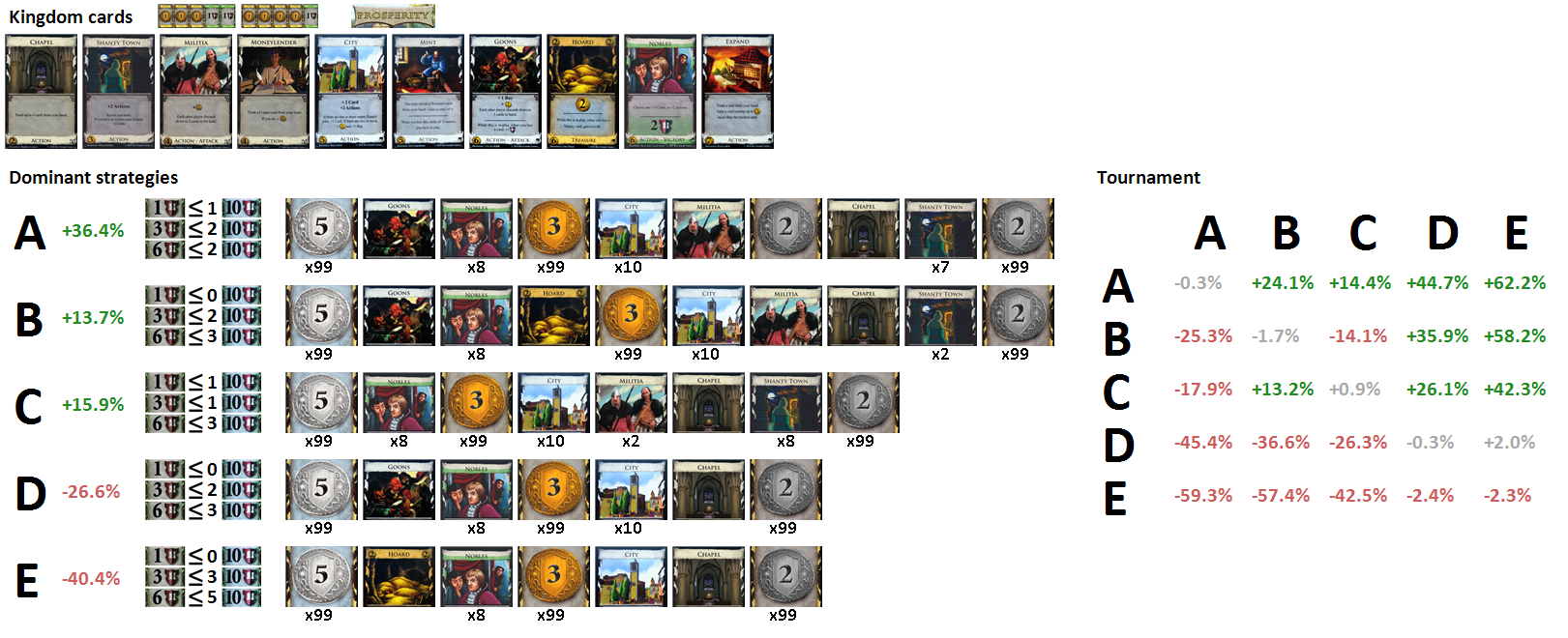 - Dominant strategies — A visual description of the buy menu for each of five strategies, and the conditions under which each strategy will purchase estates, duchies, and provinces. These follow the buy menu algorithm described above. For example, if strategy A has 3 coins, it will first buy a Silver. The second time it has 3 coins, it will buy a Chapel, and then it will transition to purchasing Shanty Towns. On the other hand, strategy B will purchase a Chapel the first time it has 3 coins. The strategy also indicates when the strategy switches to purchasing victory cards. For example, strategy A will buy estates when there is only one colony left, and will buy duchies and provinces when there are two or fewer colonies left. The number shown next to each strategy is the expected win ratio of this strategy when played against the other four leading strategies.