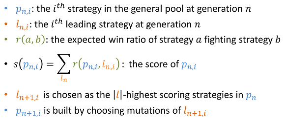 - Generational co-evolution — To determine which strategies are the best, the AI starts with a random pool of candidate strategies, and a much smaller set of dominant strategies. All strategies in the candidate pool are then tested against the leading strategies, and those that do the best become the leaders in the next generation. The new candidate pool is formed as mutations of the new leaders, and the cycle repeats.